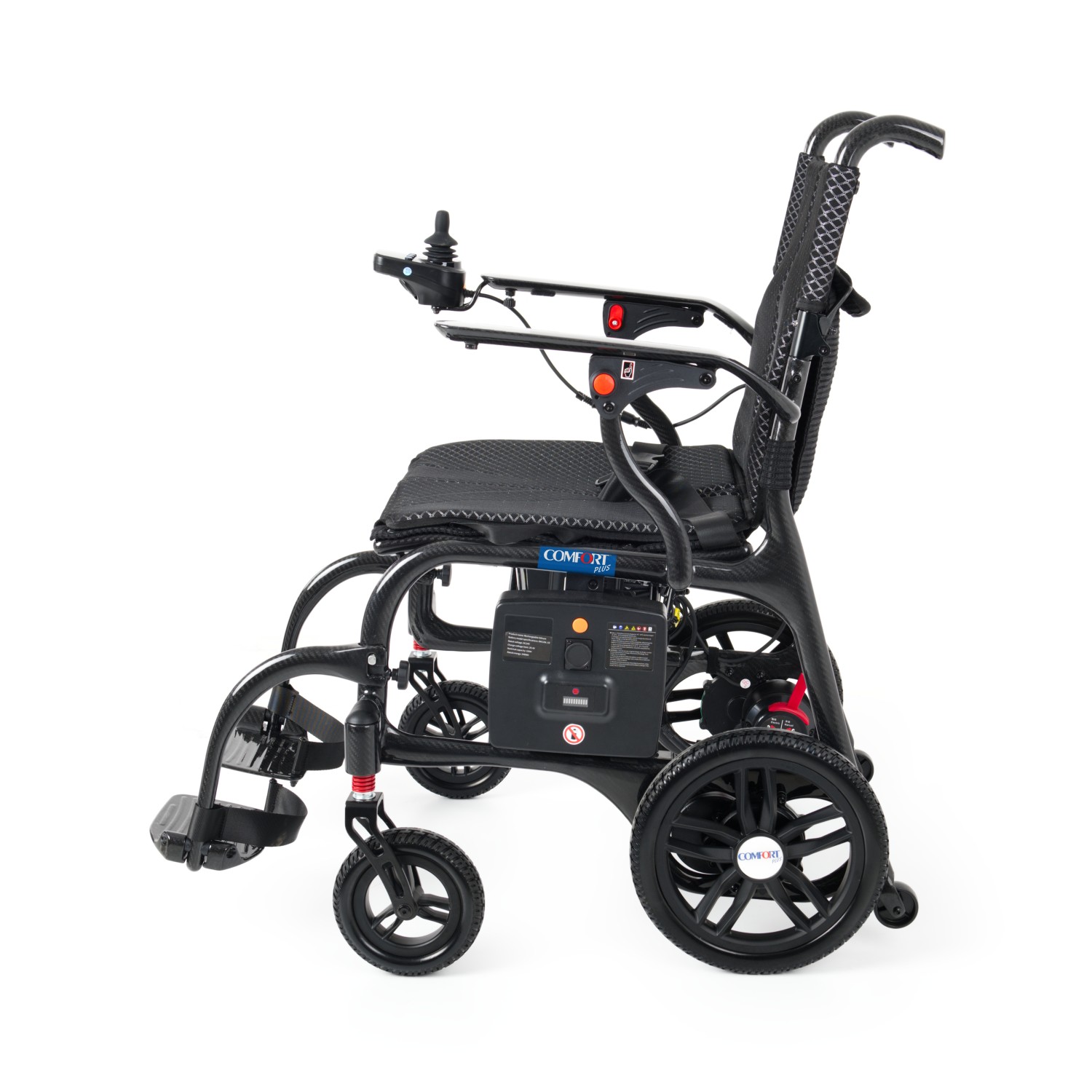 Comfort Plus DY01107 Karbon Lityum Pilli Akülü Tekerlekli Sandalye – Ultra hafif karbon fiber gövdesi ile güç, dayanıklılık ve konforu bir arada sunar. Katlanabilir tasarımı, uzun ömürlü lityum pil teknolojisi ve joystick kontrollü sürüş sistemiyle şehir içi ve seyahat kullanımına mükemmel uyum sağlar. Hafif, sağlam ve taşınabilir yapısıyla günlük hayatınızı kolaylaştırır.