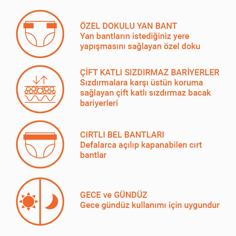 Defalarca açılıp kapanabilen cırt bantları sayesinde bezinizi gün içerisinde sık sık kontrol edebilirsiniz.