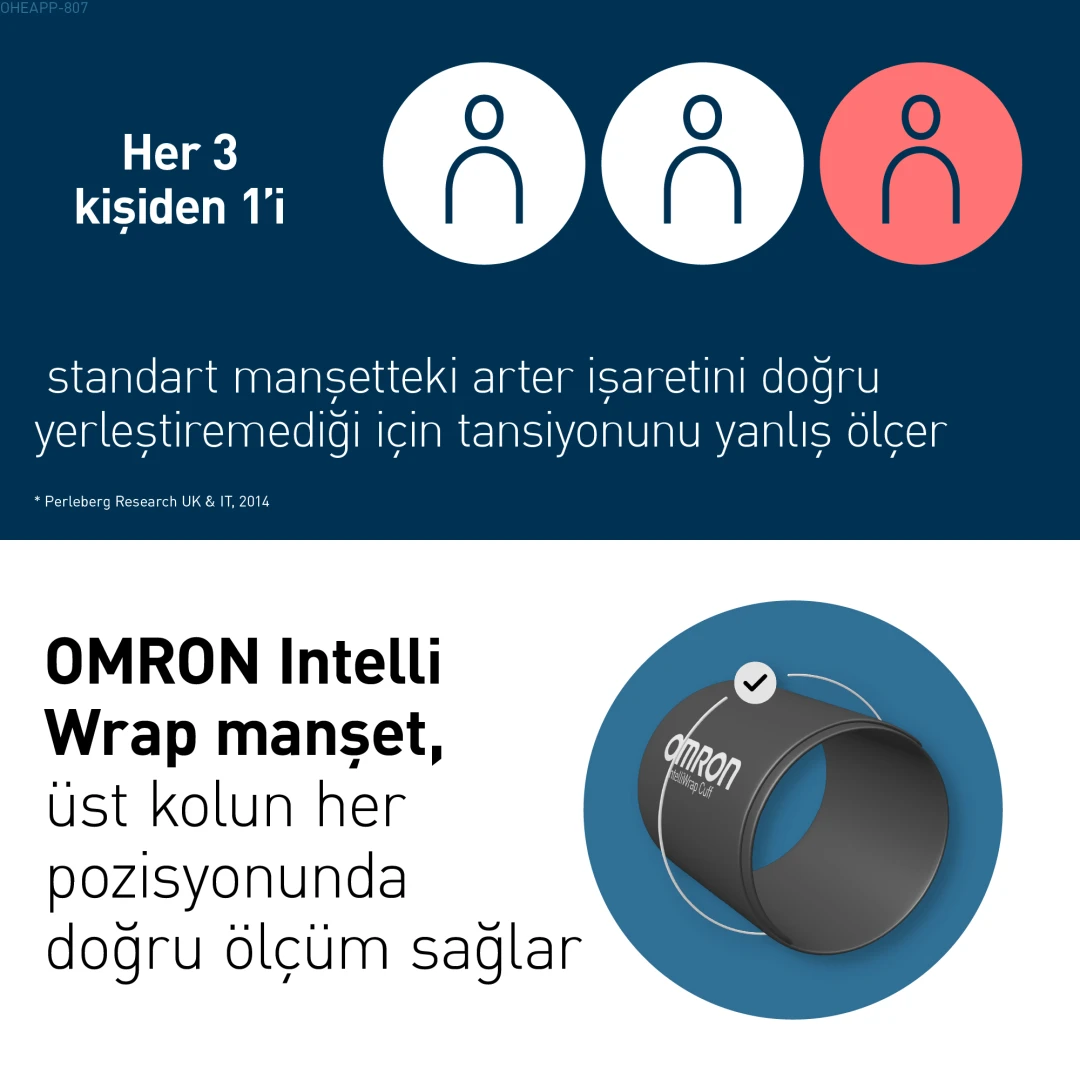 Intelli Wrap Manşet, üst kolun etrafına nasıl yerleştirildiğinden bağımsız olarak doğru ölçüm sağlar. Bu da evde ölçüm sırasında yapılan yaygın hataların büyük kısmını ortadan kaldırır.
