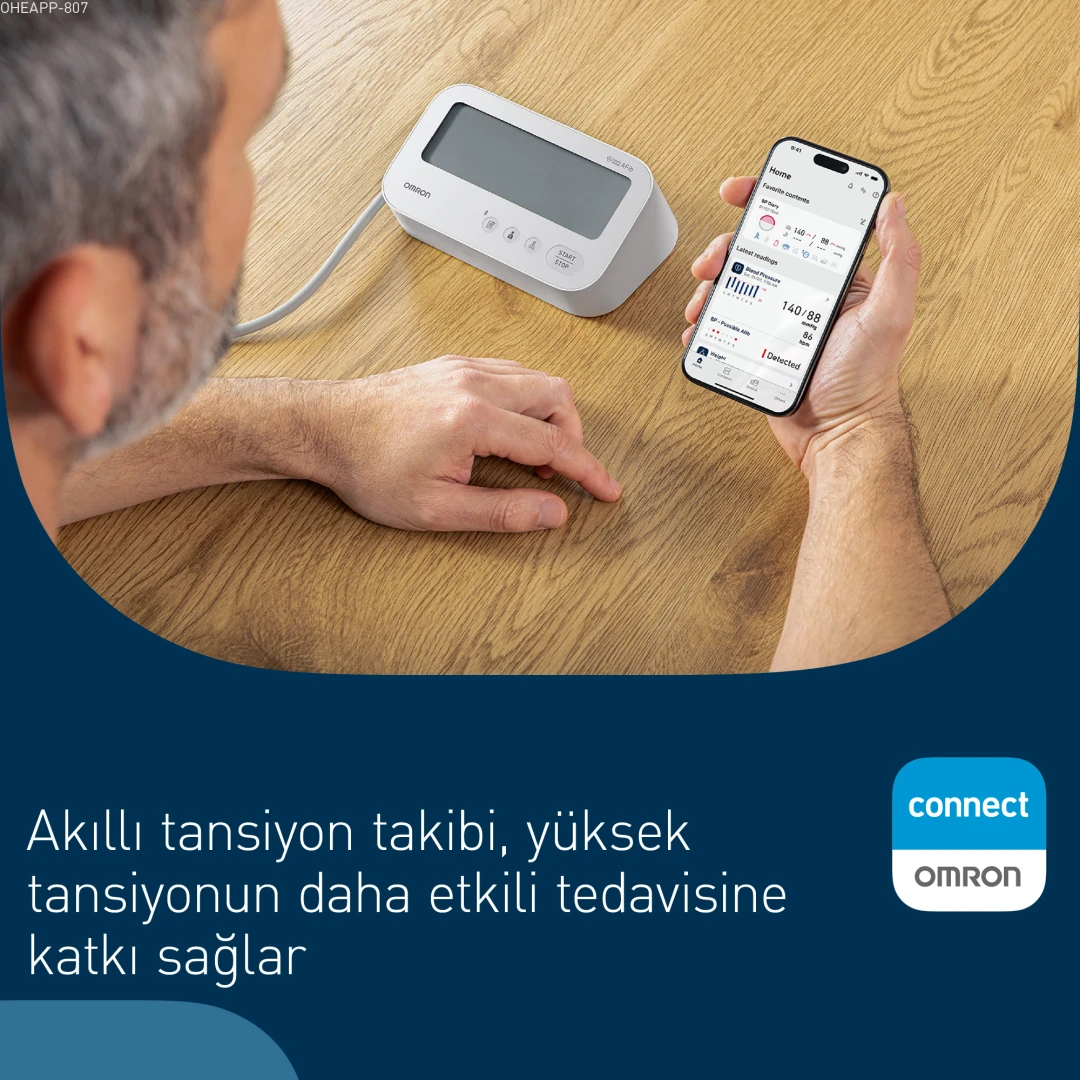 Bluetooth bağlantısı sayesinde tüm ölçümleriniz OMRON connect uygulamasına otomatik olarak aktarılır. Böylece tansiyon değerlerinizi zaman içinde takip edebilir, bu verileri doktorunuzla veya ailenizle kolayca paylaşabilirsiniz. Ayrıca Alexa üzerinden sesli komutla ölçüm sonuçlarınızı dinleyebilirsiniz.